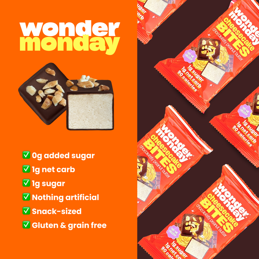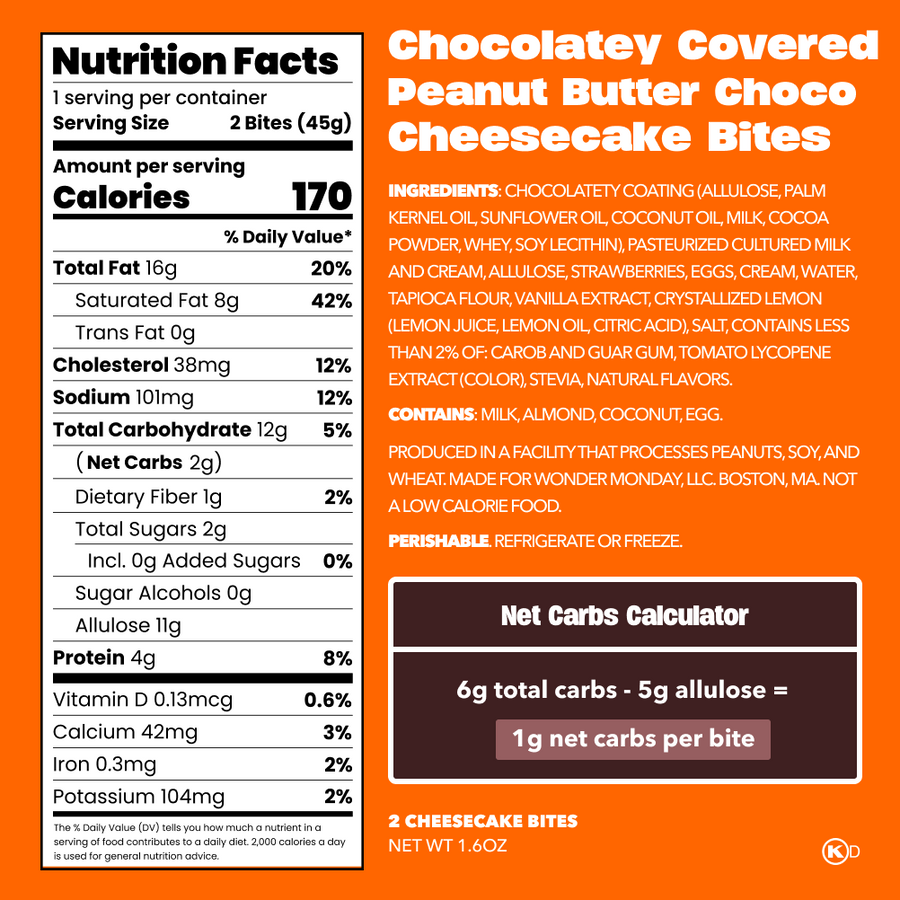 📣 LIMITED EDITION! These little bites of heaven are filled with decadent peanut butter cheesecake on the inside and covered with a rich, crunchy, chocolatey layer on the outside. They're just like biting into a Reese's cup. Each bite is hand-crafted and topped with diced peanuts for an extra crunch. With just 1g net carbs, zero grains or gluten, and nothing artificial, these cheesecakes taste too good to be true!